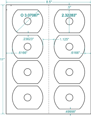 These business card labels are 59 mm in width and fit on 61mm hockey rink shape business card CD-Rs. The paper stock is the standard quality matte paper which is ideal for laser printing and works with inkjet printers as well. High-gloss labels are available by custom quote. Priced per sheet. 250 sheets per pack. |