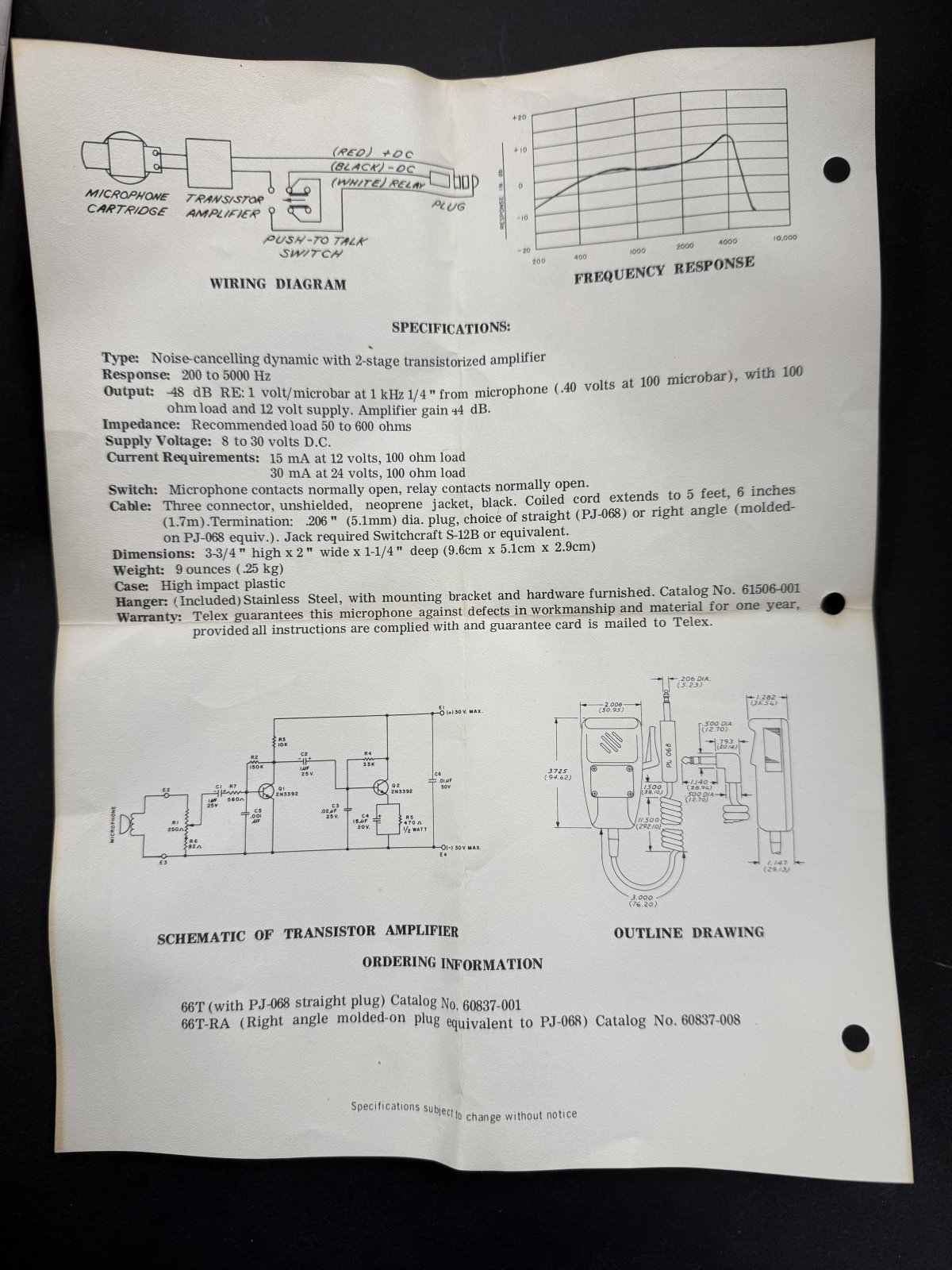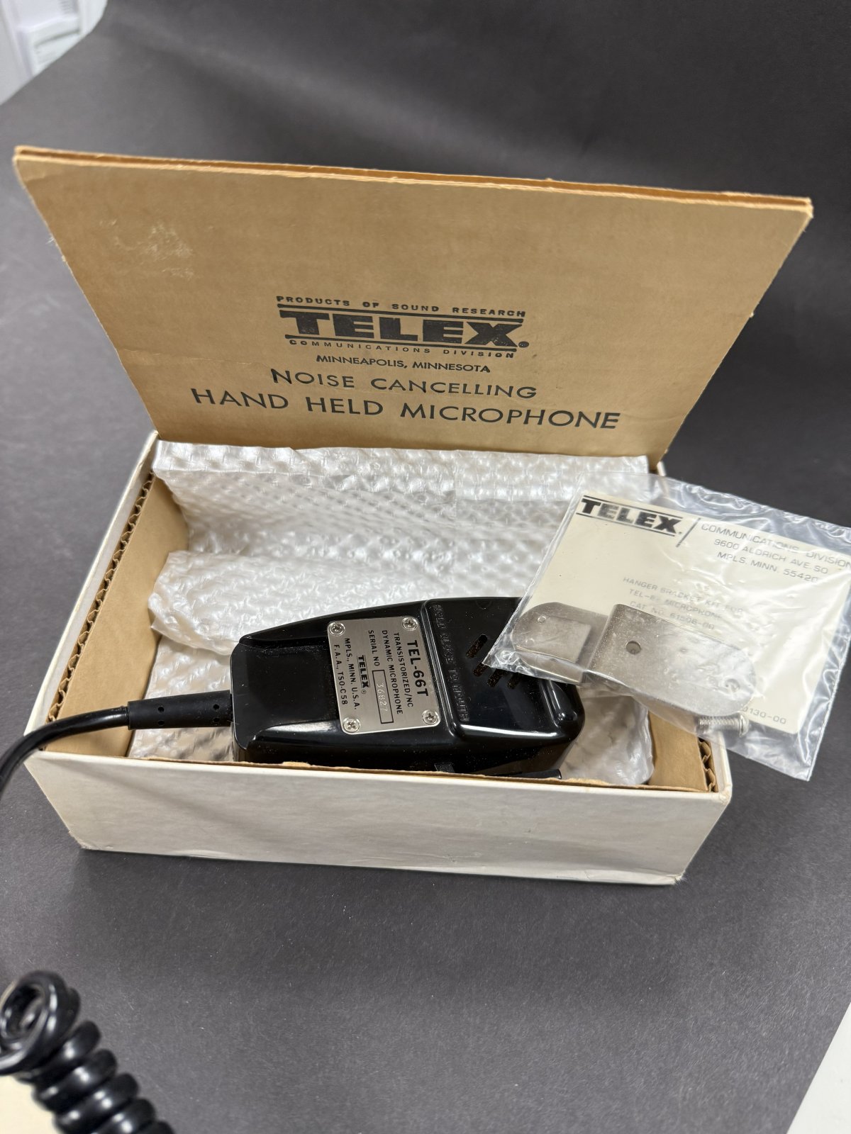 New (1974 vintage old stock) noise-cancelling microphone made by Telex primarily for aviation use in noisy environments. If you want to use this on stage or in the recording studio, you will have to find an adapter or change the PJ-068 plug to a standard 1/4" or 1/8" plug. Noise Cancellation Microphone The device consists of dynamic microphone cartridge, transistor amplifier, and push–to–talk switch in a rugged, black plastic case. A hanger bracket and mounting hardware are provided with the microphone. It comes in a 2-tone box measuring 7" x 5" x 2". |