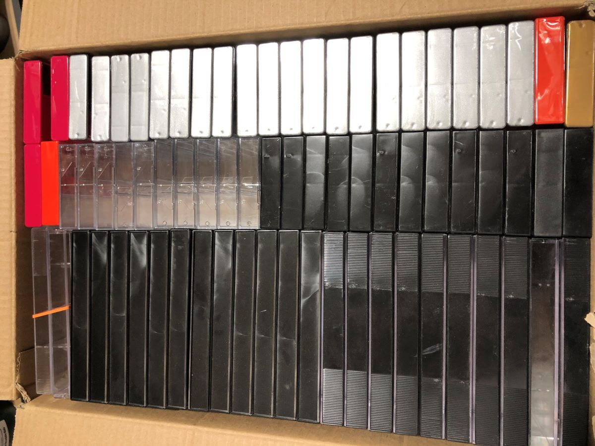 Various audio cassette cases as pictured. Could have scratches. 25 doubles cases and 50 single cases. Location 01-E1-01-08. Final sale. |